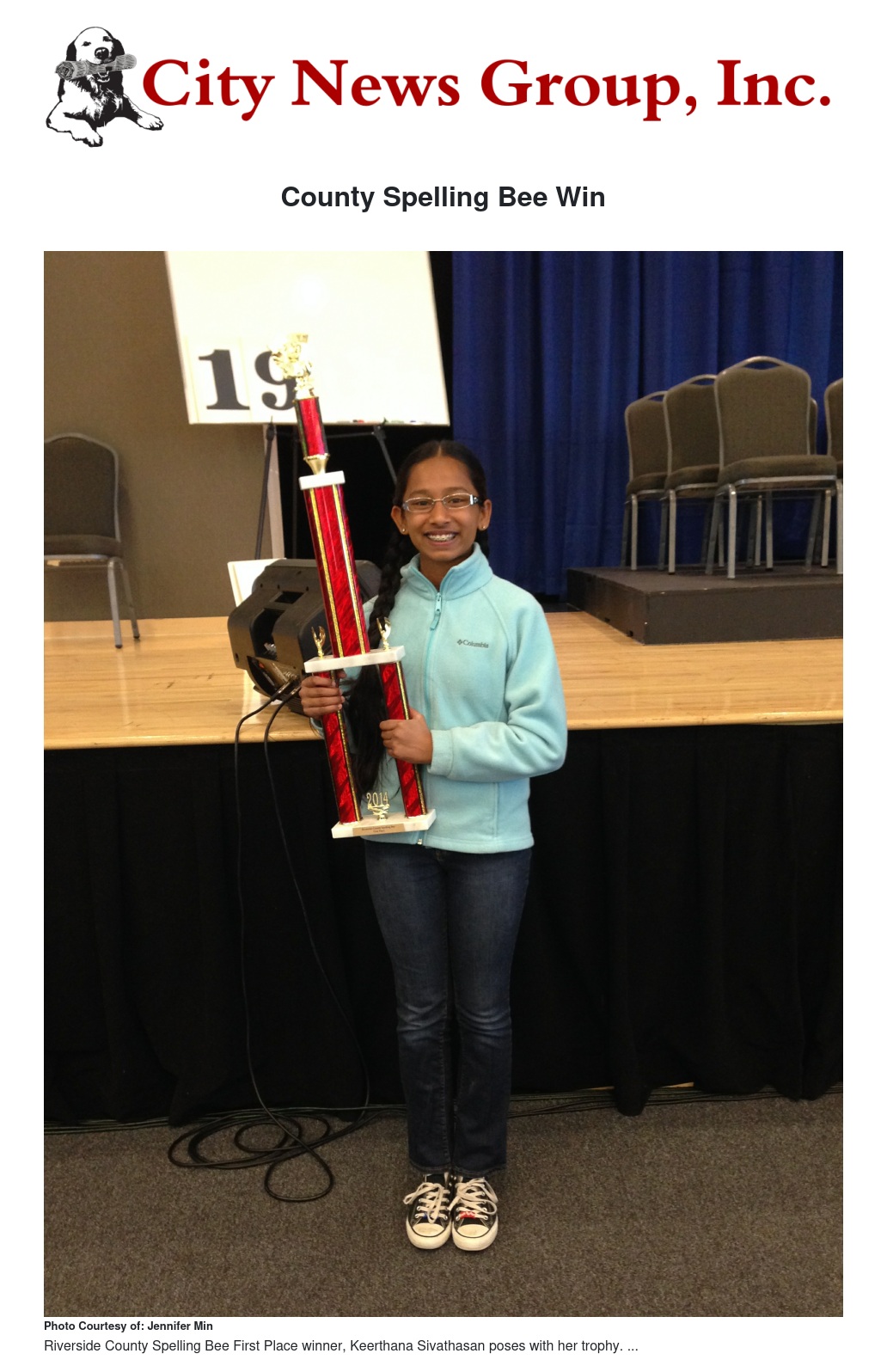 Keerthana will continue spelling competitively at the National Spelling Bee held May 25-30, 2014 at the Gaylord National Resort and Convention Center in Maryland, where she will represent Riverside County. Keerthana, 8th grader at Corona Fundamental Intermediate School, believes her success is rooted in "putting all [her] effort in it," and "making sure [she's] focused on it."