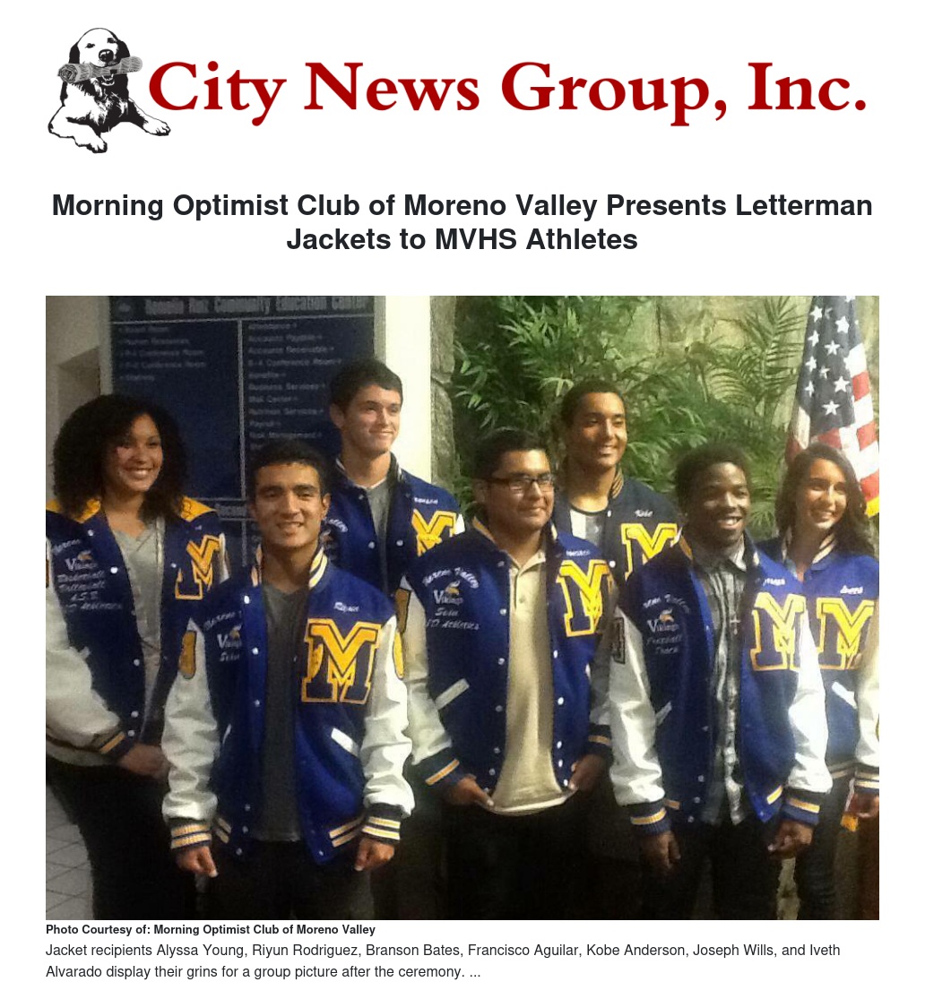 She began asking for donations for the expensive jackets and contacted George Price, who was President of the Moreno Valley Morning Optimist Club (MVMOC) at the time. The club became the Letterman Jacket Program’s main supporter, raising money for 19 jackets over the course of the year. Member Janet DuHaime is the Chairman of the Letterman Jacket Program.