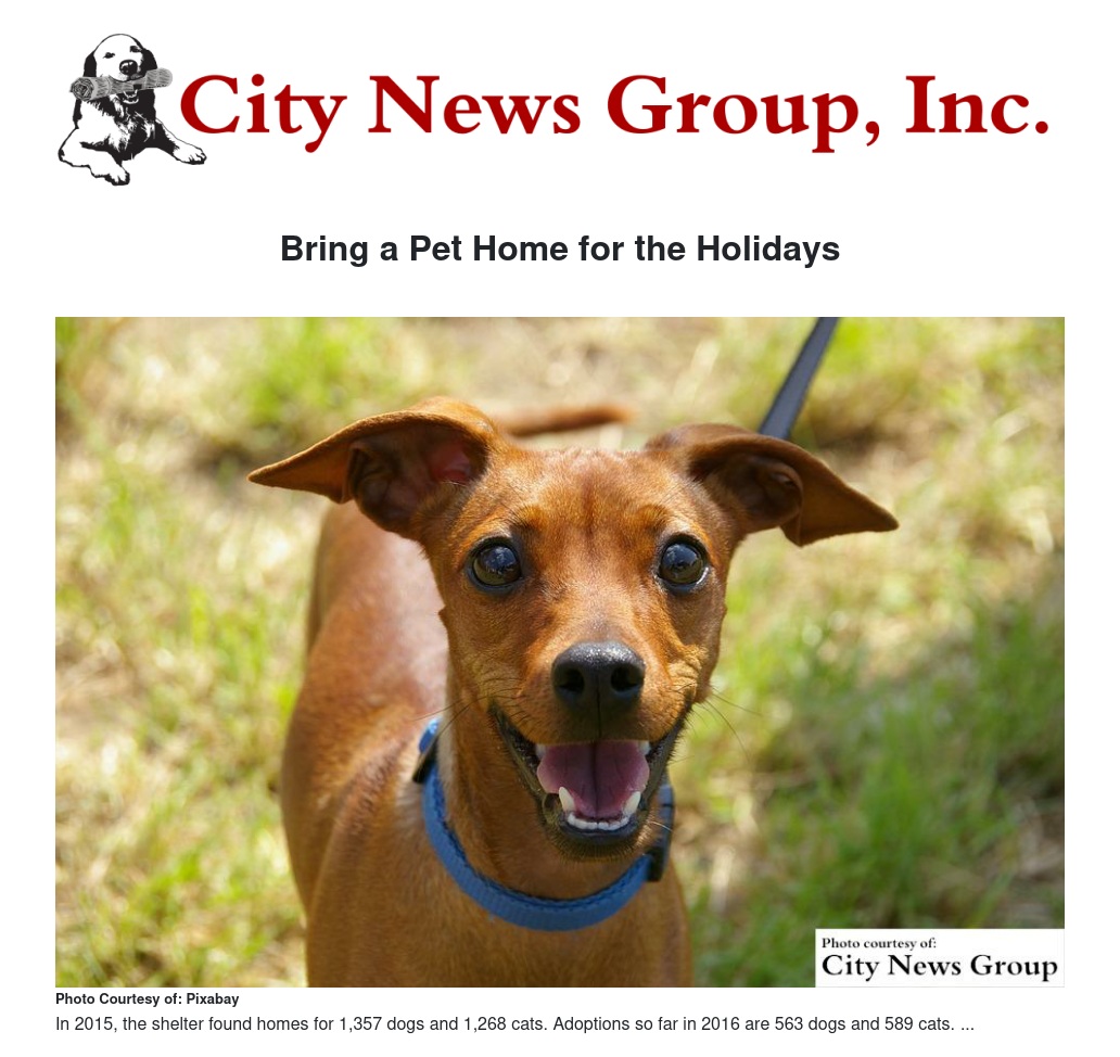 MORENO VALLEY>> Local families can make the season special by adopting a pet from the Moreno Valley Animal Shelter. The annual "Home for the Holidays" Pet Adoption promotion will offer discounted adoption rates from Tuesday, Nov. 15 through Saturday, Nov. 19. The event will run from 10 a.m. to 5:30 p.m. on Tuesday, Wednesday, Thursday and Friday, and from 10:30 a.m. to 3:30 p.m. on Saturday.