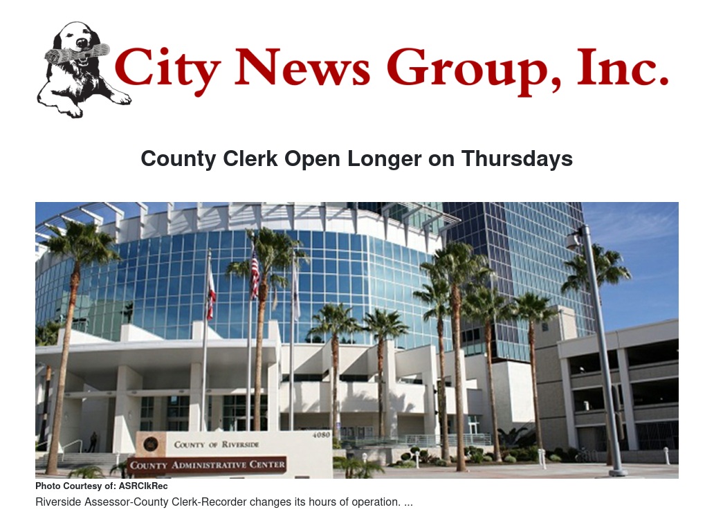 The Riverside Assessor-County Clerk-Recorder has extended its hours of operation for clerk services. The main clerk office will remain open until 7 p.m. every Thursday to assist the public.