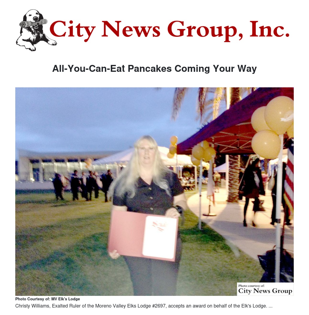 Officers of the Moreno Valley Elks Lodge #2697 will prepare and serve the breakfasts which will include eggs, bacon, sausage, juice and coffee as well as unlimited pancakes and trimmings.