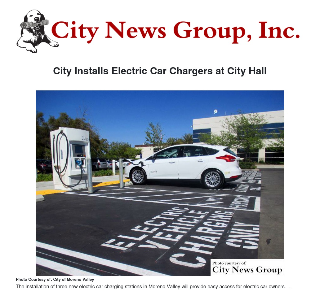 MORENO VALLEY>> On April 24, the City of Moreno Valley installed three electric vehicle charging stations at the Calle San Juan De Los Lagos City Hall parking lot.