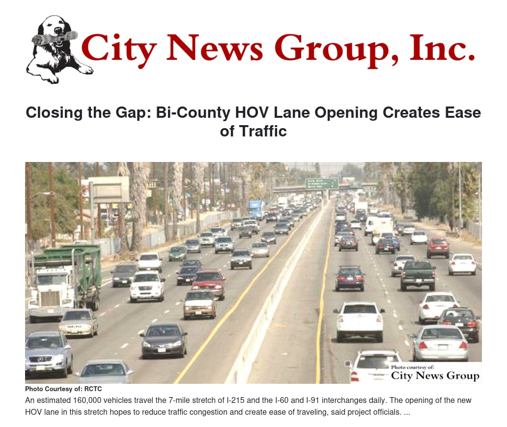 San Bernardino and Riverside County commuters may see some improvement on the freeways - in terms of congestion and ease of traffic, that is, following the opening of a carpool lane along a 7.5 mile stretch of route extending from the I-215 north of Orange Show Road in San Bernardino to just south of the 60/91 interchange.