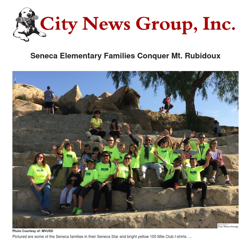 Seneca families had a busy Saturday morning recently as they hiked up Mt. Rubidoux for a PTA and 100 Mile Club function. More than 100 people “scaled the peak” and pledged to stay active by earning miles for the 100 Mile Club. PTA donated breakfast to keep everyone energized and hydrated. It was another wonderful community-building activity for the school. Another hike is being planned for May.