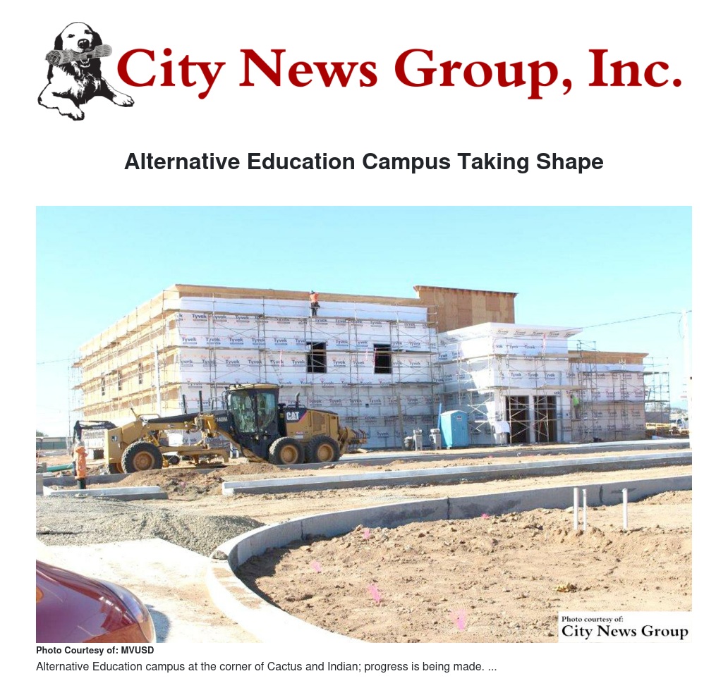You might want to take a drive past the new Alternative Education campus that’s taking shape at the corner of Cactus and Indian. The new site will be home to Bayside Community Day School, Moreno Valley Community Learning Center, Moreno Valley Online Academy (MVOA) and the Graduation Opportunity (GO) program. The new campus will have two new permanent buildings, and 37 portable classrooms and restroom buildings, totaling approximately 50,000+ square feet of building space. It also will include a library, computer lab, multipurpose room, food service room, counseling offices, other support offices and an administrative building. The multipurpose room, library, kitchen, workrooms, playing fields and hard courts will be shared by all programs. The new campus is designed with capacity for 500 students. The target for completion is this summer.