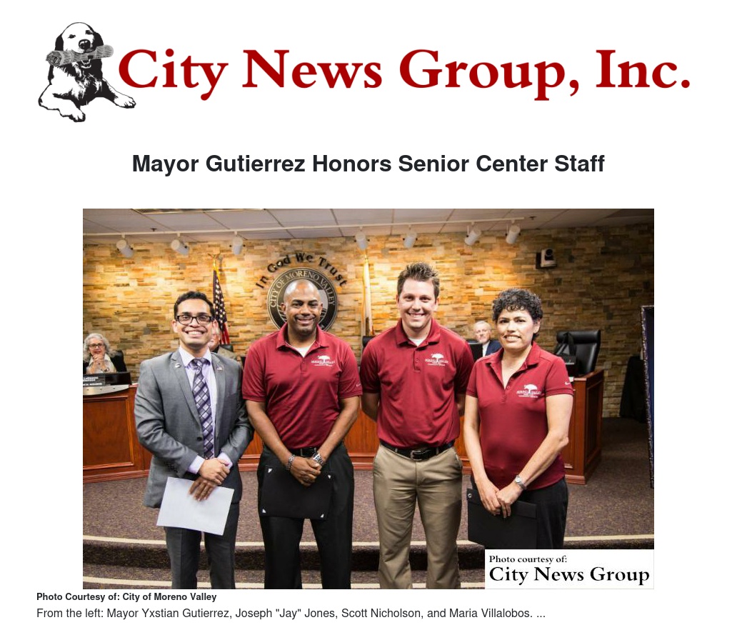 "These employees plan, lead, and manage the activities and daily operations to enhance the lives of Moreno Valley's senior citizens. Staff also provides a warm and friendly environment, which makes our seniors feel cared for and valued. We are grateful to have such a dedicated group amongst the ranks," said Mayor Gutierrez.