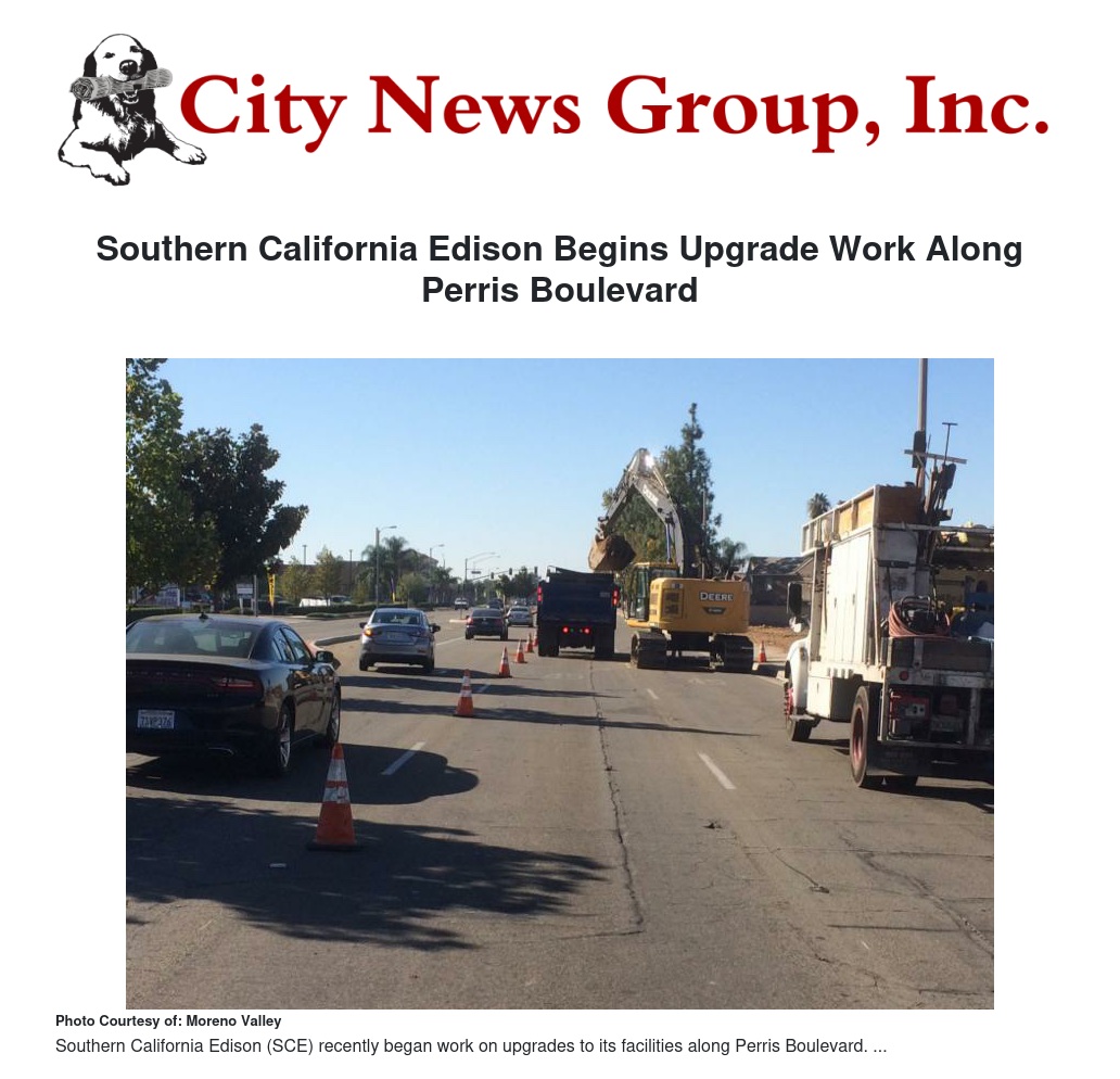 Southern California Edison (SCE) recently began work on upgrades to its facilities along Perris Boulevard. The work includes, increasing the capacity to deliver power to the surrounding area and placing the lines underground. The project area extends from John F. Kennedy Drive to the southerly City limits.