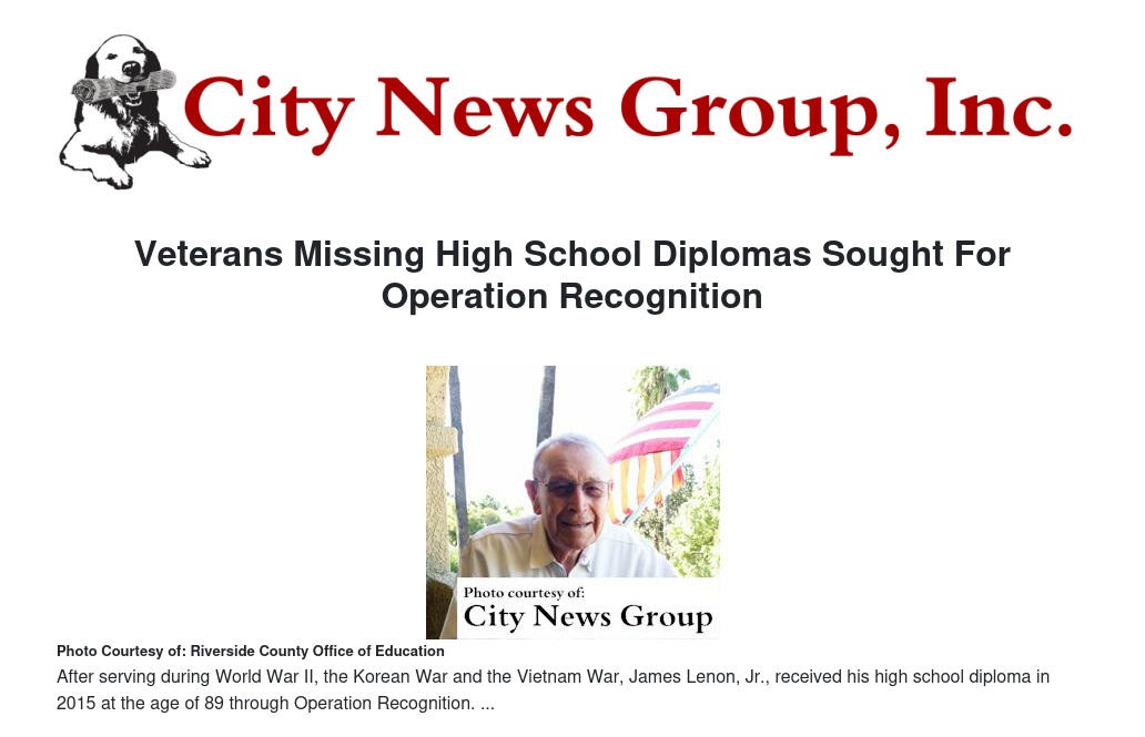 More than 300 veterans have received those all-important documents through the Riverside County Operation Recognition Program since 2007. The diplomas are awarded as a joint effort of the Riverside County Board of Education and the Riverside County Department of Veterans’ Services.