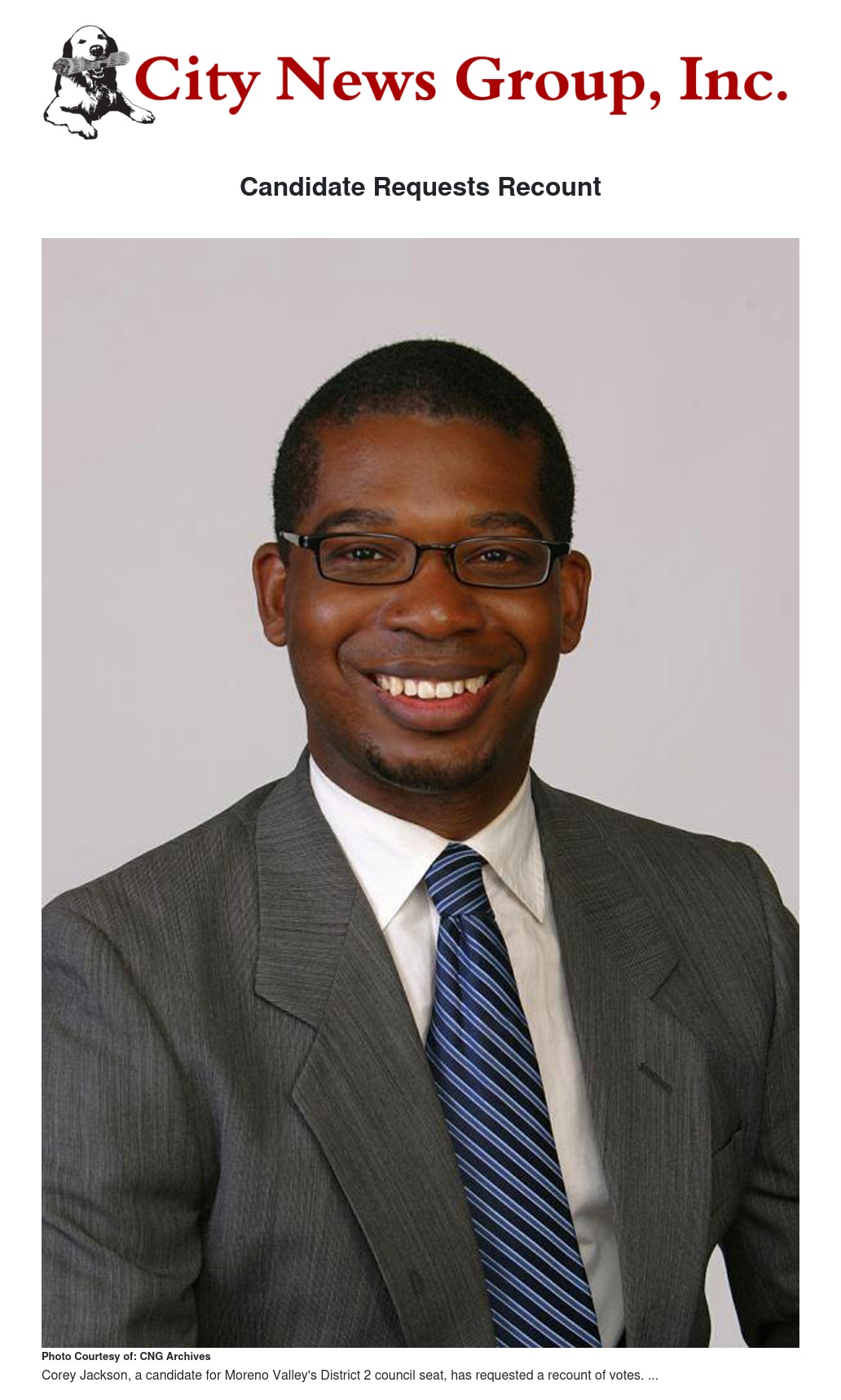 "I got a number of requests by people in the second district" for the recount, Jackson told the Moreno Valley City News. "We want to make sure that every vote was counted properly and trust in the results."