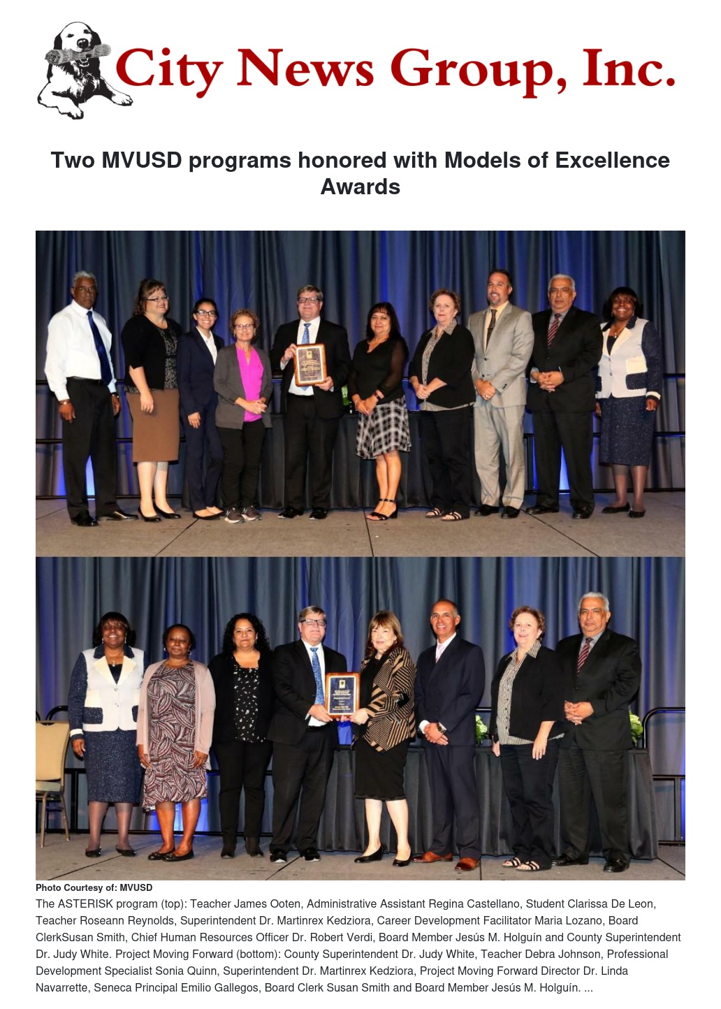 Moreno Valley Unified is proud to have received two Riverside County Office of Education Models of Academic Excellence Awards, presented Tuesday. The most awards that any district was eligible for is three. The awards were presented at a luncheon during the Riverside County Education Summit, the awards recognized programs that have been successful in improving student academic achievement.