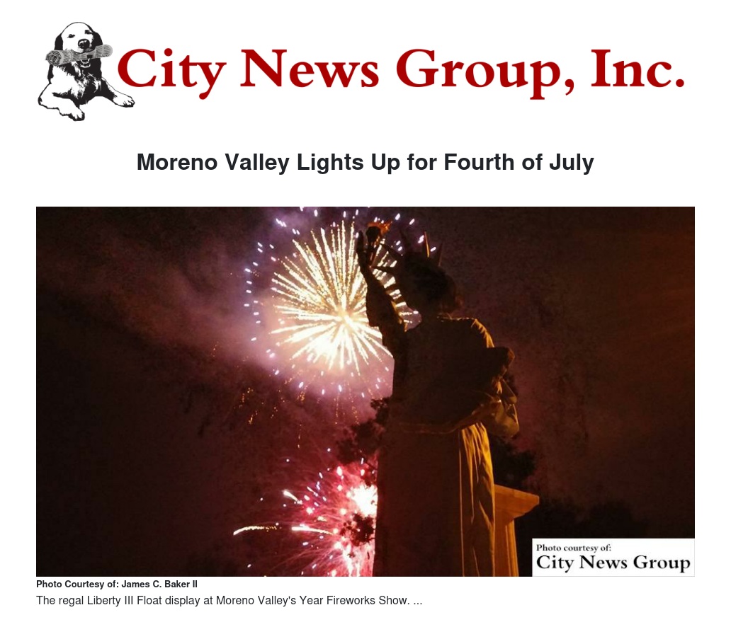 "Everything turned out beautifully," said Commissioner James C. Baker II, chair of the Parks and Recreation Commission for the City of Moreno Valley. "To add icing to the cake, we were able to capture some spectacular photos of the Liberty III Float's displays."