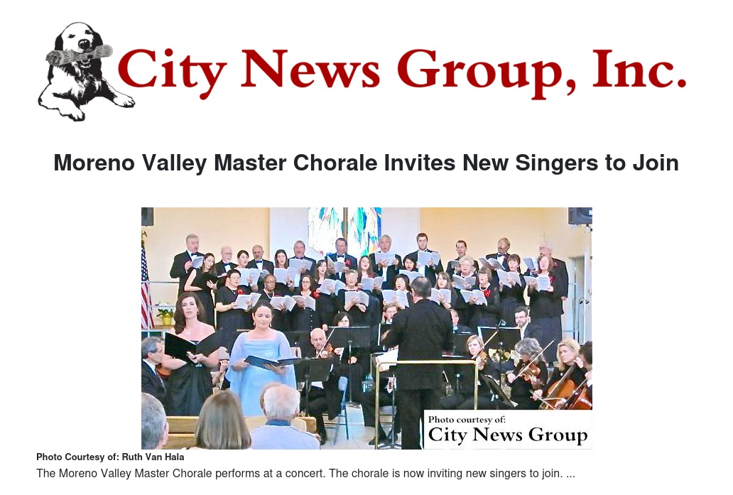 The Moreno Valley Master Chorale will also have openings for several young singers after the group recently received