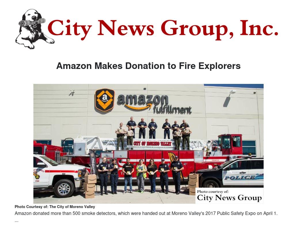 MORENO VALLEY>> Amazon recently donated 550 smoke detectors and smoke/carbon monoxide detectors to the City of Moreno Valley Fire Explorers to help encourage residents to install the life-saving devices.