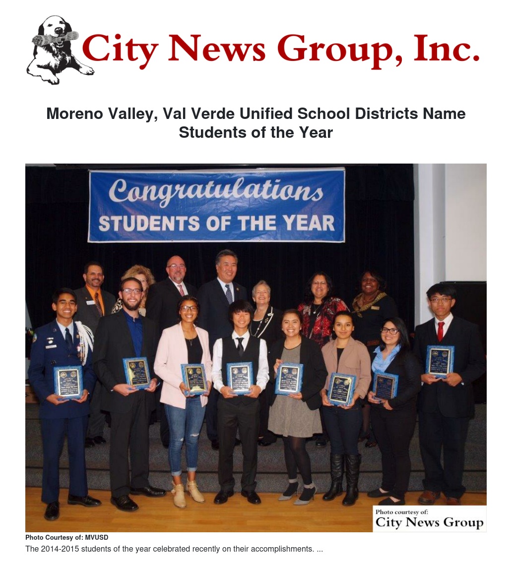 Several speakers noted how unusual it is for two neighboring school districts to work together so closely to honor their students. Congratulations to all the Students of the Month, and to this year’s Students of the Year: Audesie Butler (Bayside), Mehdi Kazi (CSHS), Veronica De La Torre (MMHS), Mariana Yepez (MVHS), Wesley Poon (VVHS), Vanessa Ruvalcaba (VDLHS), Jacqueline Yanez (CHHS), Bryan Lov (RVHS), Cynthia Rubio Nuñez (Val Verde), Alicia Becerra-Romero (Val Verde Academy) and Jonathan Dietz (Middle College High School). Thanks is also given to the Moreno Valley Chamber of Commerce and President Oscar Valdepeña for making it all possible.