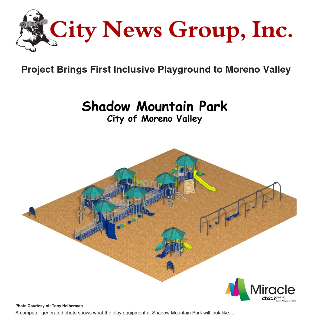 MORENO VALLEY>> The City of Moreno Valley is hosting a groundbreaking ceremony for installation of new inclusive playground equipment at Shadow Mountain Park, 23239 Presidio Hills. The event will take place on Thursday, Oct. 13, 2016 at 10 a.m.