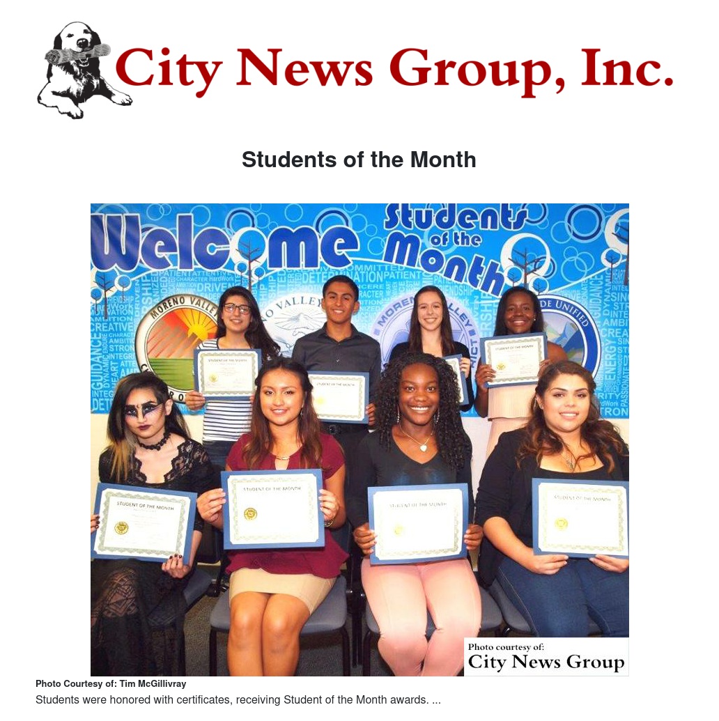 They are Andrea Echeverria (CSHS); Diahann Castellon (CHHS); Jeresha Lockhart (MMHS); Kassity Flores (CHHS/Middle College High School); Maggy Harake (MVHS); Nicholas Vallin (RVHS); Ashley Ramirez (Val Verde HS); Camryn Purdom (VVHS); and Christine Castanon (VLHS).