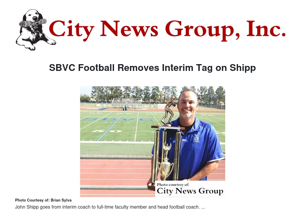 San Bernardino Valley College has just announced the re-designation of John Shipp from interim coach to full time faculty member and head football coach. The San Bernardino Community College District approved his hire as of July 1.