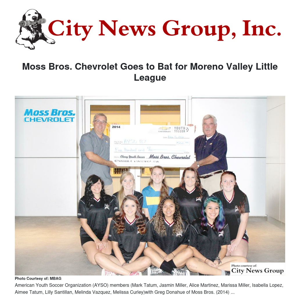 In addition, Moss Bros. Chevrolet will present a check representing a one-time monetary contribution to Moreno Valley Little League. Sponsored leagues across the country will have the chance to earn additional funds as community members take test drives at their partnering dealership to help support the league.
