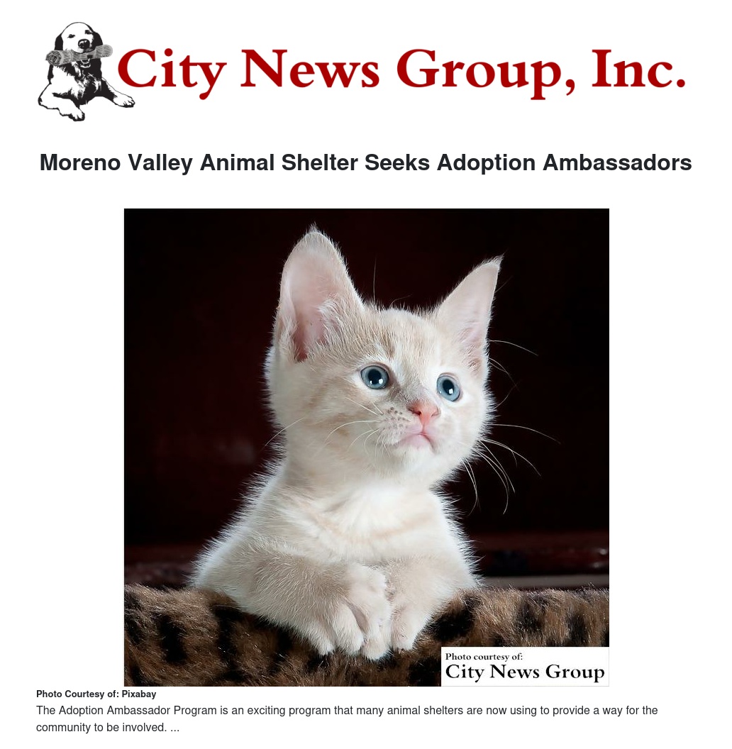 Moreno Valley is increasing the number of adoptions for homeless animals and wants to do even more. In an effort to boost the number of positive outcomes for homeless companion animals, the Moreno Valley Animal Shelter has launched the Adoption Ambassador Program sponsored, in part by the American Society for the Prevention of Cruelty to Animals (ASPCA). Adoption Ambassadors foster, evaluate and ultimately find the animal a loving home. Moreno Valley is able to launch this program with the help of a $2,500 ASPCA grant.