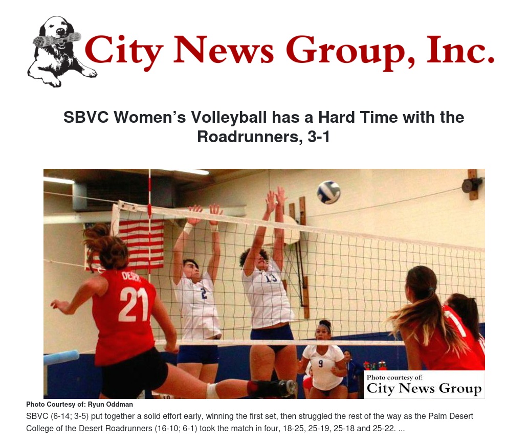 SBVC (6-14; 3-5) put together a solid effort early, winning the first set, then struggled the rest of the way as the Palm Desert College of the Desert Roadrunners (16-10; 6-1) took the match in four, 18-25, 25-19, 25-18 and 25-22.