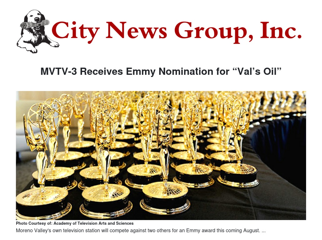 The City of Moreno Valley’s MVTV-3, the city’s own television station located inside City Hall, was announced by the Academy of Television Arts and Sciences to be one of three nominees competing in the Public Service Announcement Category of the 65th Annual Los Angeles Area Emmy Awards for the “Val’s Oil” public service announcement (PSA).