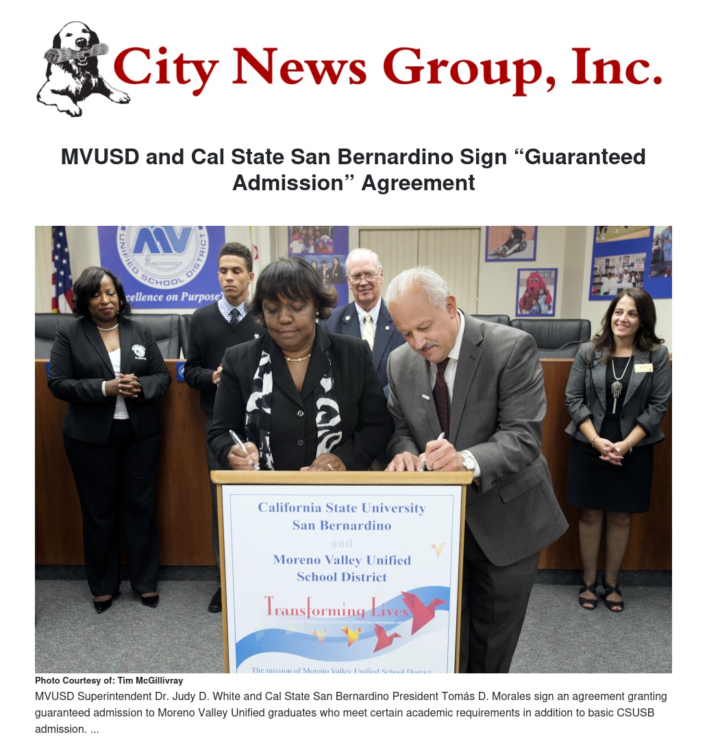“Suddenly, with this agreement, attending college has become much more of a reality for many students who otherwise might have found themselves standing at the back of the line, waiting to see whether there will be room for them,” said MVUSD Superintendent Dr. Judy D. White. “Both our students and Cal State San Bernardino win with this agreement.”