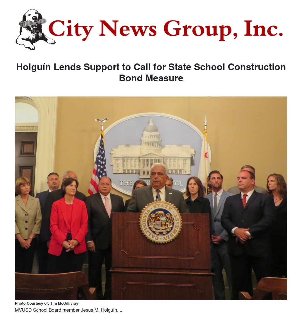 MVUSD School Board member Jesus M. Holguín, who also serves as president-elect of the California School Boards Association (CSBA), joined supporters of a proposed state school construction bond measure at a news conference in Sacramento Monday, explaining that the measure has the support not only of Republicans and Democrats, labor and business, but also school boards across California.