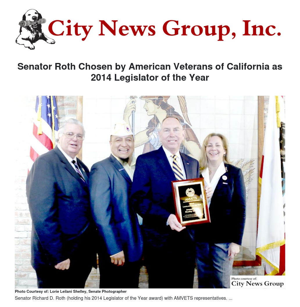 Senator Richard D. Roth (D-Riverside) has been chosen by the American Veterans Department of California (California AMVETS), an organization that serves California’s military veterans, as their 2014 Legislator of the Year for his continued commitment to fighting for veterans throughout the State.