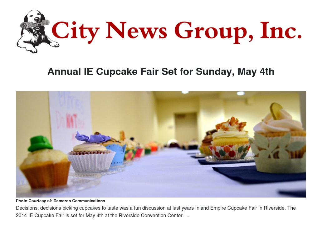 The Second Annual Inland Empire Cupcake Fair is set for Sunday, May 4, 2014, at the Riverside Convention Center. The fair has cupcake tastings, judging, giveaways, cake decoration demonstrations by California Cake Decorations & Supply Co., live entertainment, free massages, Kids Zone provided by Seeking Sitters Inland Empire, Craft Corner and lots of shopping!