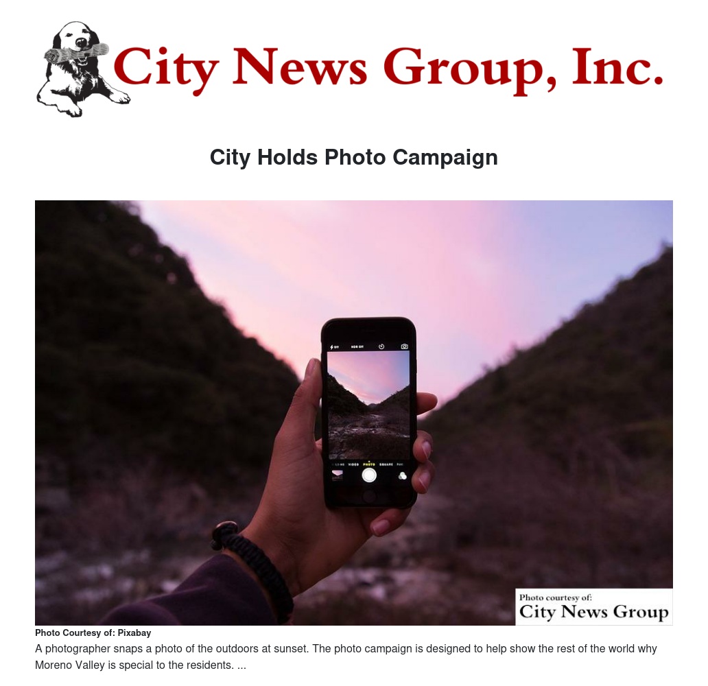 "Grab your camera or your smartphone and capture what Moreno Valley means to you," said Marshall Eyerman, City Treasurer of Moreno Valley, in a press release. "It could be a picture of your uncle manning the grill during a family barbeque, an early morning hike to the M on Box Springs Mountain, your child's visit to Storytime at the City Library, or a local athlete sinking free throws at Celebration Park."
