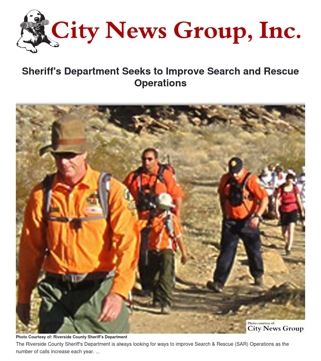 MORENO VALLEY >> The Riverside County Sheriff’s Department is responsible for all Search and Rescue (SAR) calls for help within the unincorporated areas of Riverside County. Annually, the Sheriff’s Department responds to 150-170 SAR related incidents. The number of SAR operations continue to increase over the years as the county continues to grow.