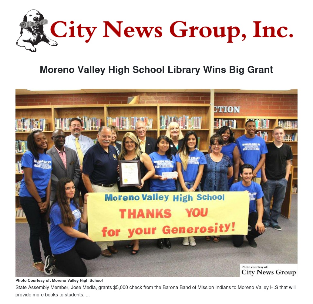 Many thanks to the Barona Band of Mission Indians and to Assembly member Medina and his outstanding staff for their continuing support for public education and for Moreno Valley schools and students.