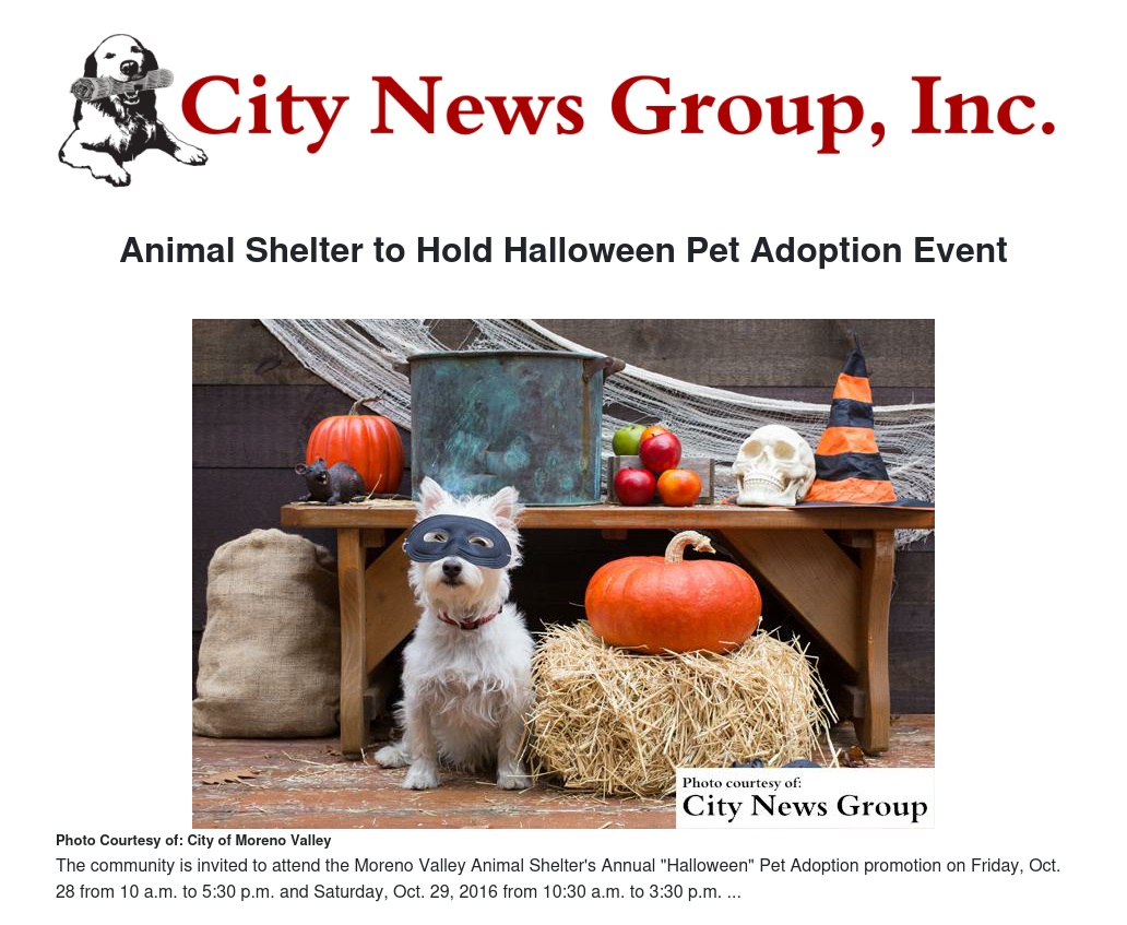 MORENO VALLEY>> The Moreno Valley Animal Shelter will hold its Annual "Halloween" Pet Adoption promotion on Friday, Oct. 28 from 10 a.m. to 5:30 p.m. and Saturday, Oct. 29, 2016 from 10:30 a.m. to 3:30 p.m.