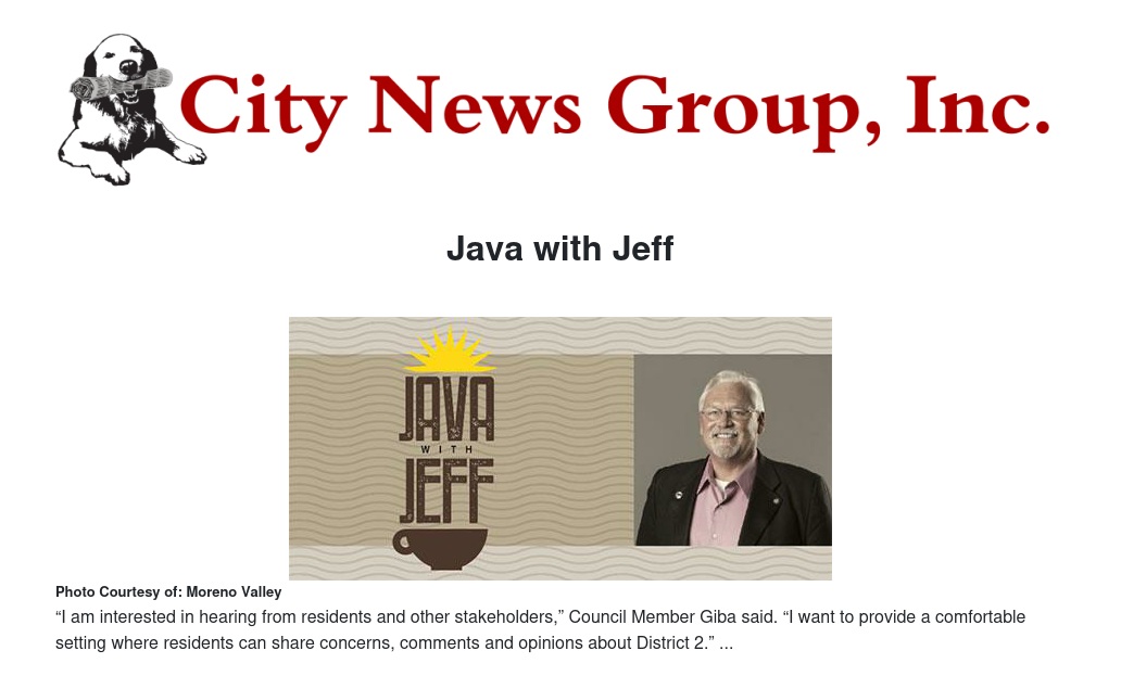 Moreno Valley Council Member Jeffrey Giba will host a Java with Jeff event Saturday, August 19 to meet with residents and answer questions. Council Member Giba represents Council District 2.