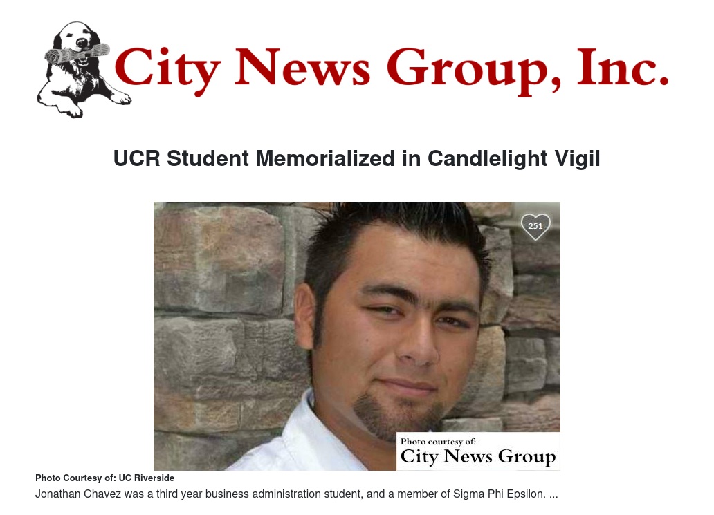 According to James Sandoval, UCR’s Vice Chancellor for Student Affairs, "The outpouring of support, grief, and concern we have received since the tragic news of Jonathan’s death was released has been phenomenal. It is evident that we have lost a very special young man and beloved member of our campus community.”