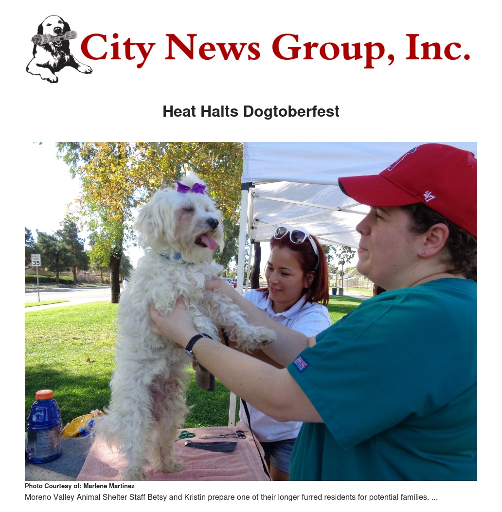 This year's first event to kick-off the season was Moreno Valley Animal Shelter's Dogtoberfest Walk-A-Thon Pet Walk scheduled to take place at the Towngate Memorial Park in Moreno Valley.