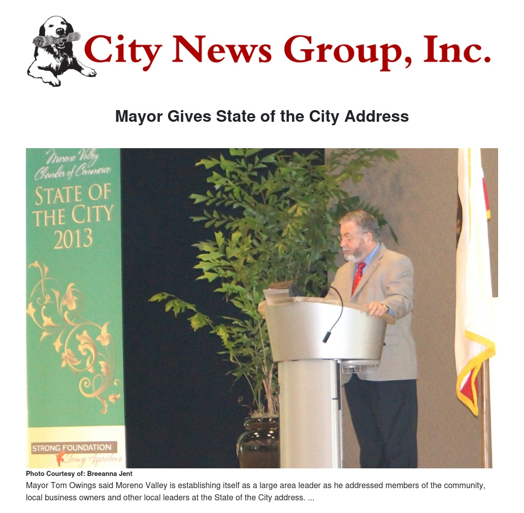“Our progress is real,” he said, “and the state of our city is striking, sound and strong. Moreno Valley is claiming its leadership role as the second largest city in Riverside County.”