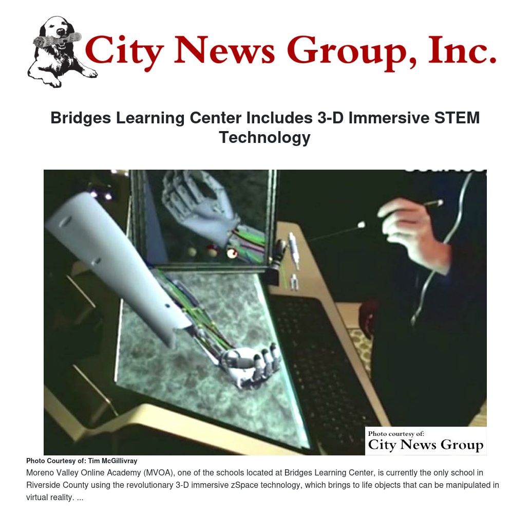 Moreno Valley Online Academy (MVOA), one of the schools located at Bridges Learning Center, is currently the only school in Riverside County using the revolutionary 3-D immersive zSpace technology, which brings to life objects that can be manipulated in virtual reality.