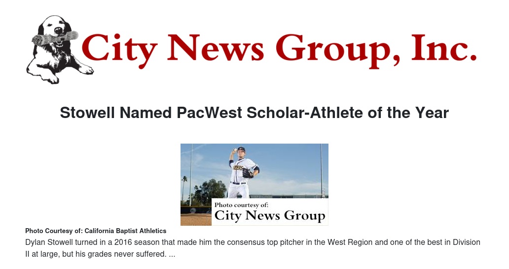 MORENO VALLEY >> After bringing in a host of awards, including three NCAA Division II All-American accolades, California Baptist University's Dylan Stowell was honored for his academic performance when he was named the PacWest Baseball Scholar-Athlete of the Year.