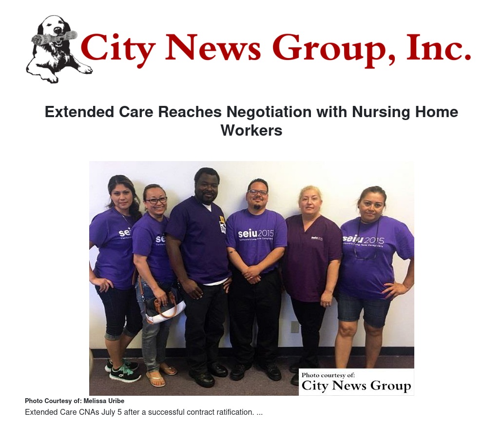 Extended Care is one of the many facilities in California that nursing home workers are striving to improve care and staffing levels at. SEIU Local 2015 nursing home workers, including those at Extended Care, are currently working to pass a bill, AB 2079, in the state Legislature. This bill addresses the chronic understaffing at nursing home facilities by requiring them to upgrade the amount of care time a patient receives a day. The bill will be heard in the Senate Appropriations Committee in August before moving to the Senate Floor for a vote.