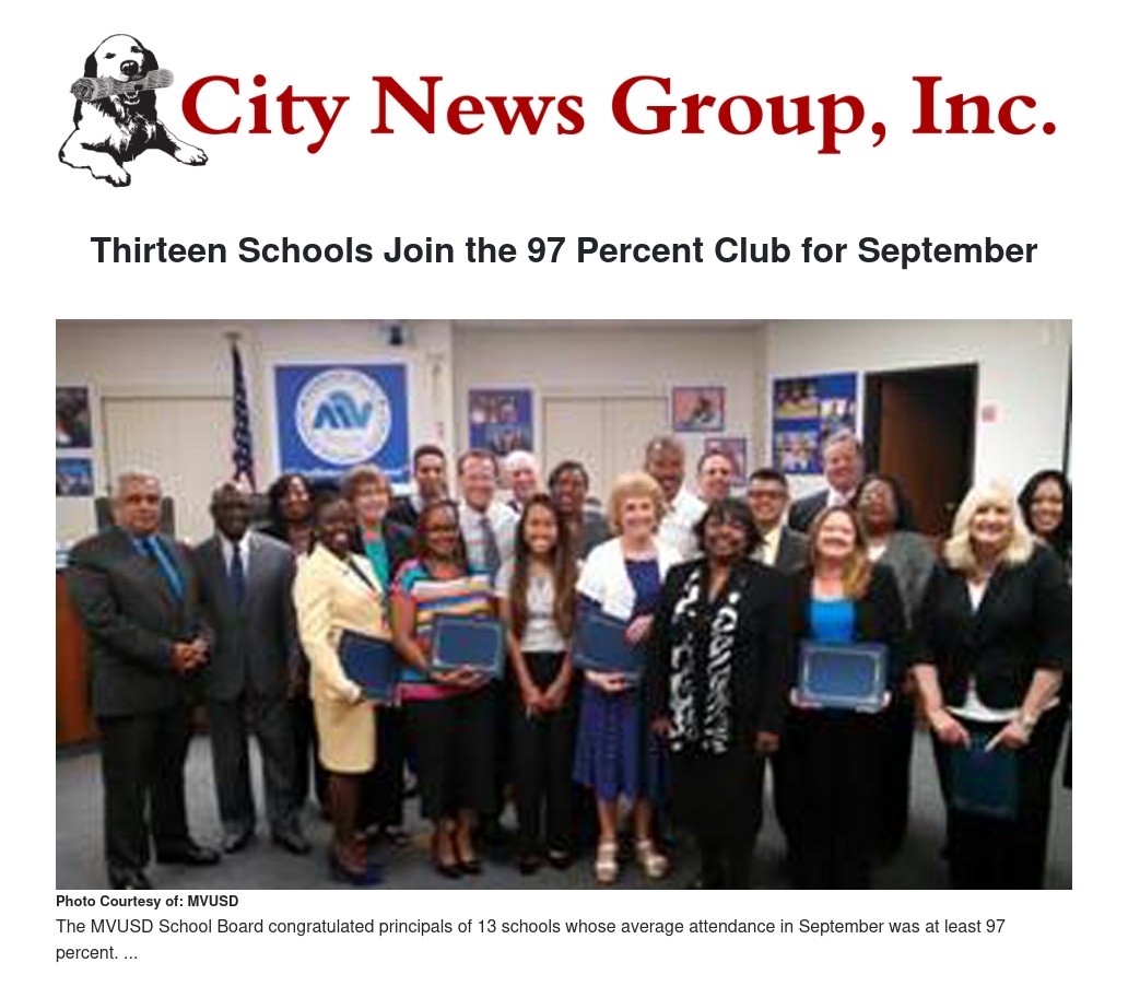 The MVUSD School Board congratulated principals of 13 schools whose average attendance in September was at least 97 percent. North Ridge Magnet Elementary was at the top of the list with 97.92 percent.