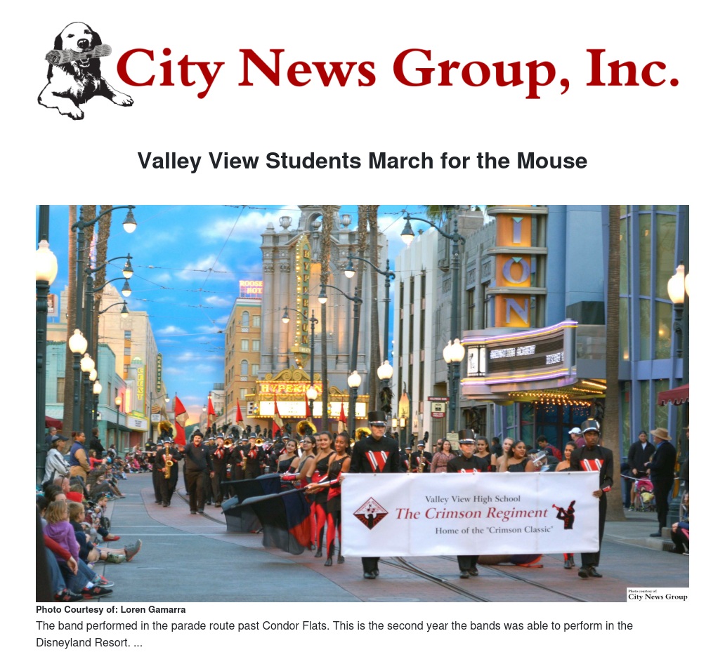 On Wednesday, Jan. 20 members of Valley View High School’s Crimson Regiment performed in the 5 p.m. parade route past Condor Flats in Disney’s California Adventure Park. This is the second year the band has performed in a parade at Disneyland according to Director of Instrumental Music, Loren Gamarra. Additionally, the band worked with Sal Lozano in a workshop provided by Disney two years ago.