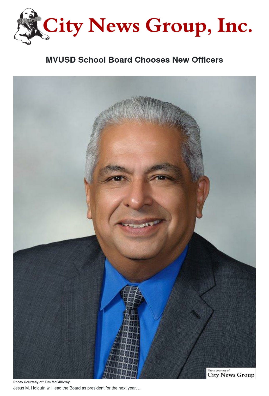 “I am honored by the trust shown in me by my colleagues,” Holguín said. “It’s a great time to be part of MVUSD in any capacity, let alone as president of the School Board. Our wonderful teachers, classified staff and district leadership team are some of California’s very best, and our continuing improvements in student academic achievement clearly demonstrate that.”