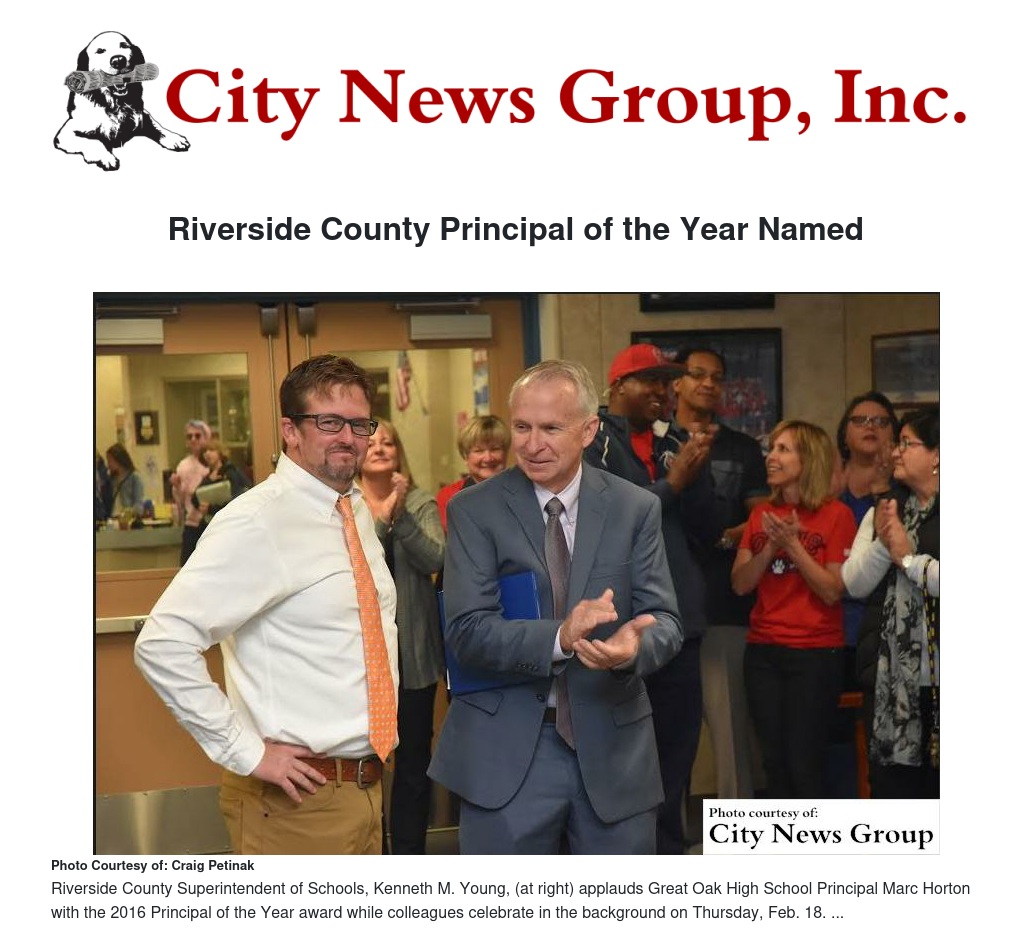 Great Oak High School Principal Marc Horton was named the Riverside County Principal of the Year by Riverside County Superintendent of Schools, Kenneth M. Young, in an early morning surprise visit in the main lobby of the Temecula Valley Unified School District high school last week.