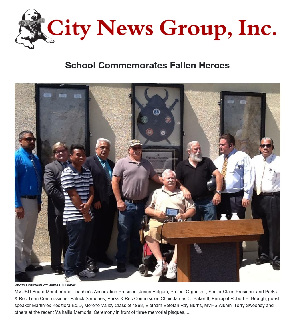 On May 30th, at Moreno Valley High School, The Valhalla Memorial was unveiled before a crowd of about 250 parents, teachers, students and guest.