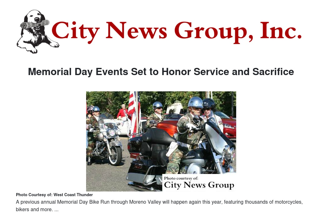 Patriots in Moreno Valley will come together to enjoy the West Coast Thunder Memorial Day Bike Run/Parade at approximately 9:30 a.m. on Sunnymead Boulevard. During this event, thousands of motorcycles travel eastbound between Frederick and Heacock Streets. The parade will last approximately one hour.