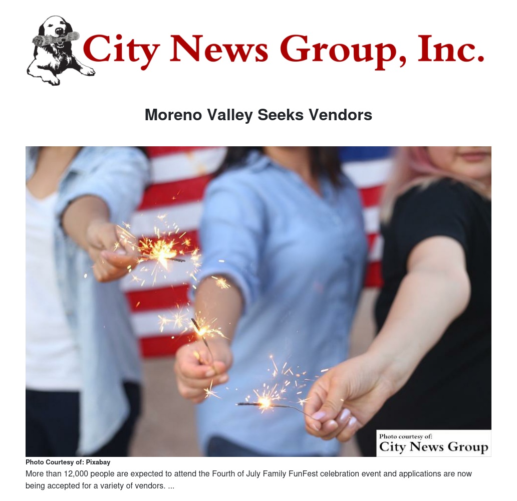 MORENO VALLEY>> The City of Moreno Valley is seeking vendors for its Fourth of July Family FunFest celebration that will be held on Tuesday, July 4 from 2 p.m. to 9 p.m. at March Mountain Middle School and Morrison Park.
