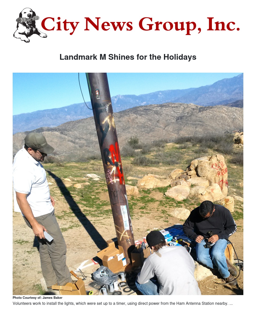 A group of volunteers headed by Parks and Recreation Commissioner James C. Baker III, worked to completely light up the newly refurbished landmark M on the side of Box Springs Mountain on Christmas Eve. The landmark's total Christmas lighting — which stayed lit through the new year — was a first for the city.