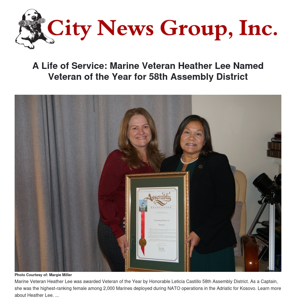 On November 26th, 2025, the 58th Assembly District - spanning Corona, Eastvale, parts of Riverside, and Grand Terrace - came together to honor US Marine Corps Veteran, Heather Lee, as the 2025 Veteran of the Year. This award is given to one Veteran in the district per year. The award was presented by The Honorable Leticia Castillo, and in attendance were: Grand Terrace Mayor Bill Hussey; Council Members Jeff Allen and Doug Wilson; and Lee’s mother, Gail Seekins.