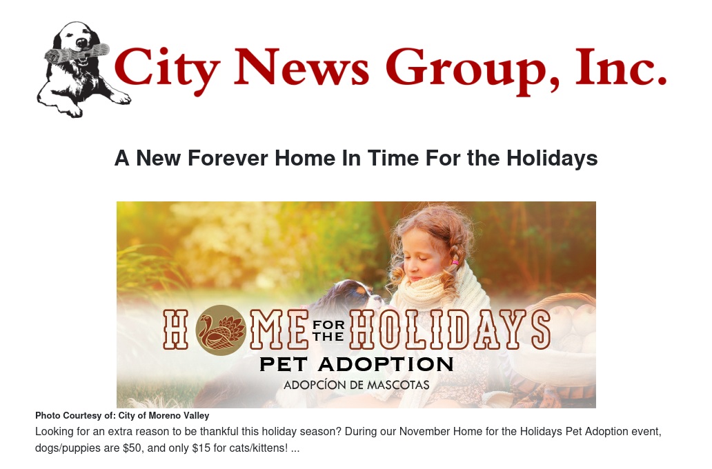 Pets adopted that have not been altered will stay for surgery and will be available to go home on the afternoon of the day surgery is scheduled. There has never been a better time to take home your new best friend from the Moreno Valley Animal Shelter!